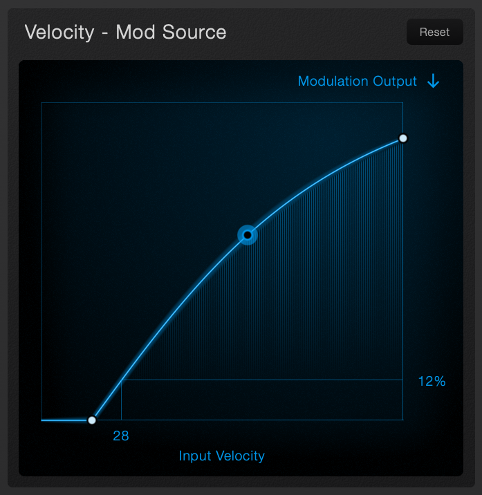 - In the example above, playing a note with velocity 28 will output a value of 12% to any connected mod targets.
