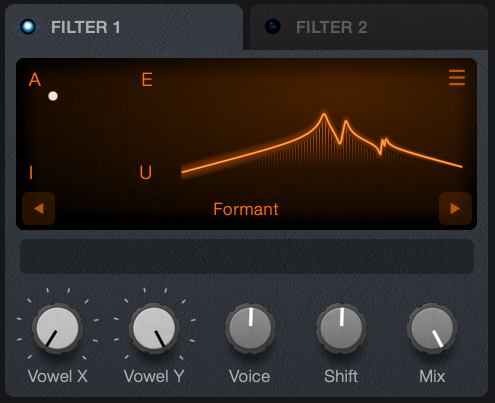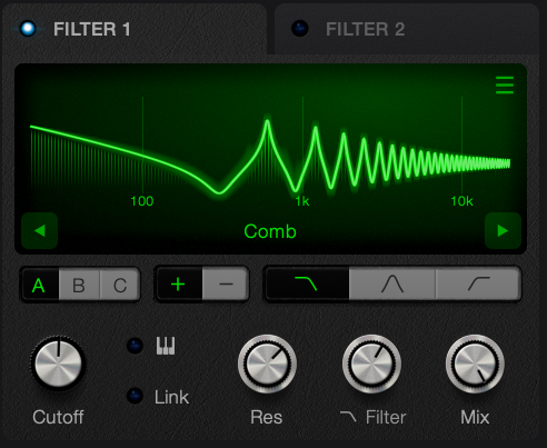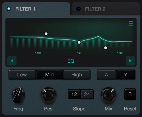 There are 2 filters available per voice or note played, accessed via the tabs. Each filter can be set to one of the following modes