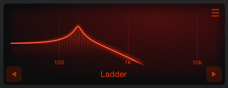 Shows the frequency curve for the selected filters. Dragging the screen will adjust the base Cutoff and Resonance levels. - Filter Mode Selector