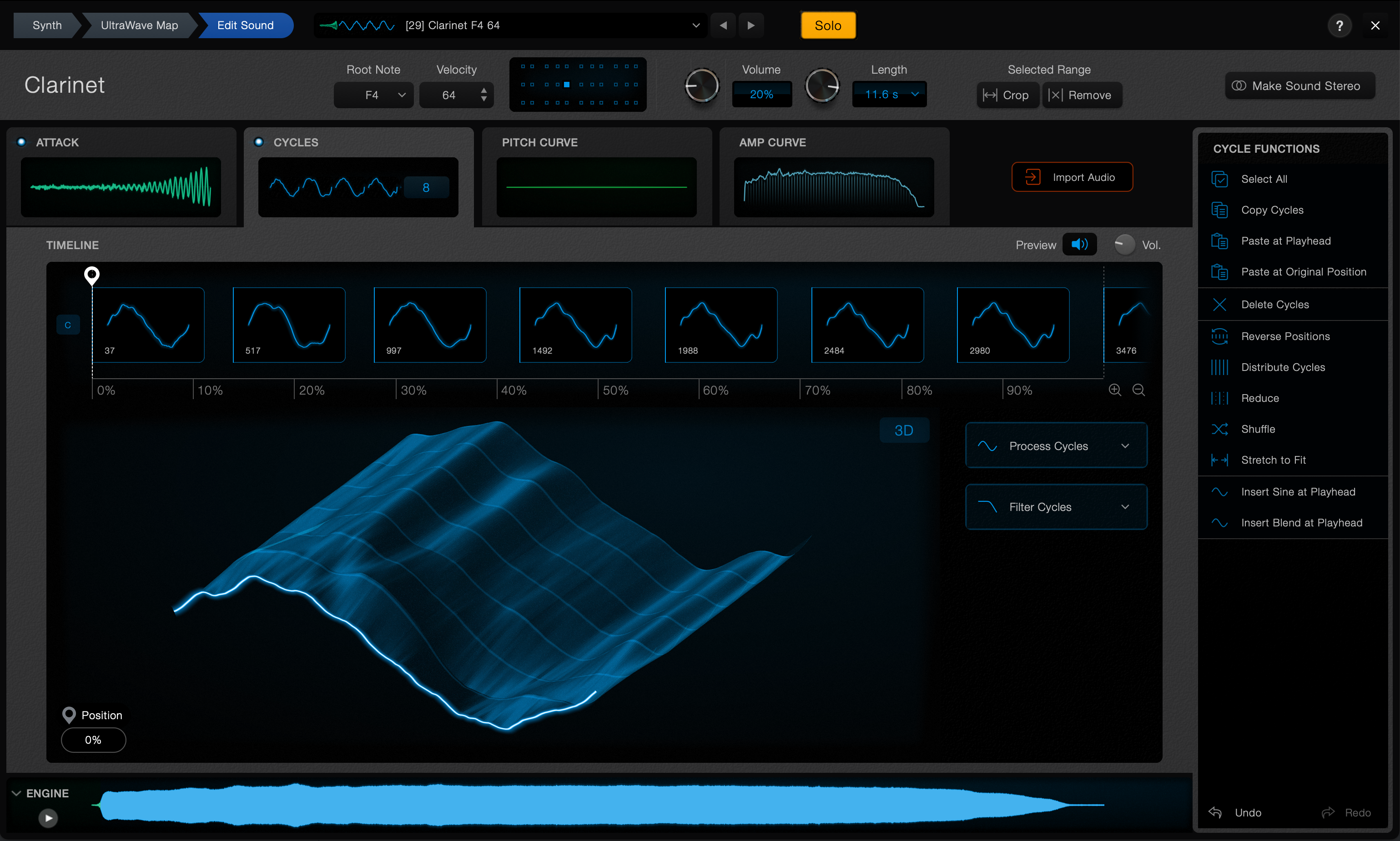Click these tabs to show a panel that allows fine tuning of the various aspects of the sound: Attack, Cycles, Pitch Curve, Amp Curve and Import WAV.